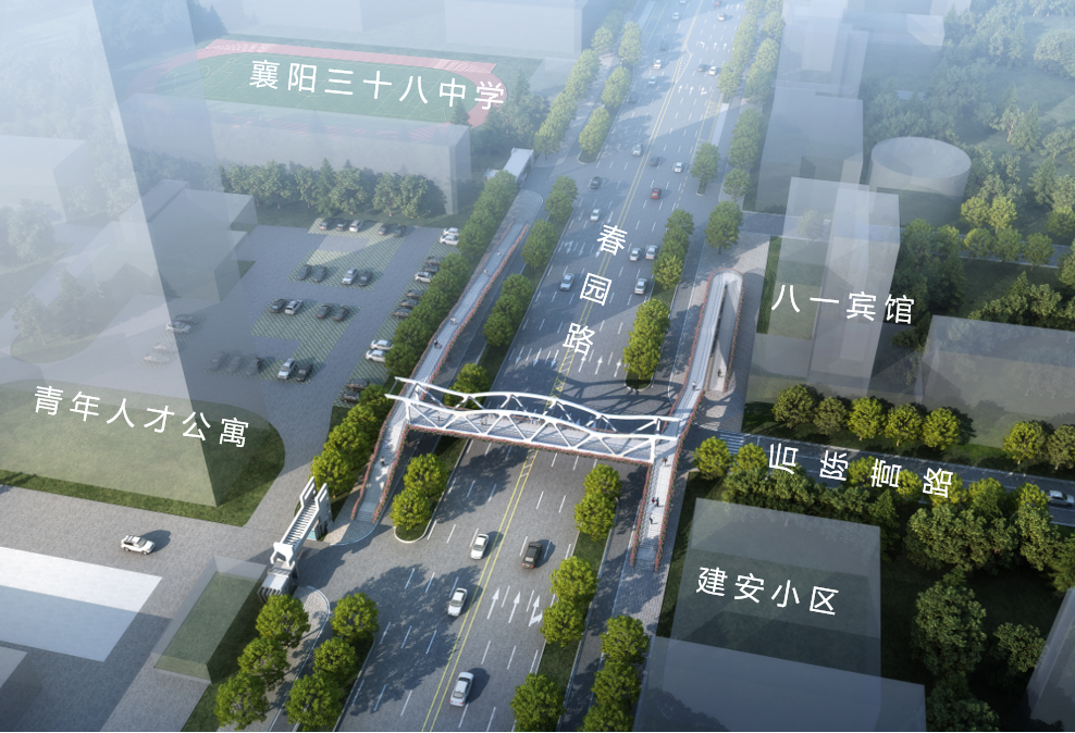 襄阳三十八中学人行天桥位于襄阳市樊城区,横跨现状春园路,采用类似“H”字形平面布局。天桥主桥位于后陈营路路口北侧,与春园路垂直;梯道靠近航天春园小区、青年人才公寓及建安小区;中学侧坡道位于春园路三十八中学侧人行道范围,上跨规划道路,预留4.5m规划道路净空,坡道落地点靠近中学大门;后陈营路坡道位于春园路西侧人行道,采用折返坡道在后陈营路路口落地,满足后陈营路4.5m通行净空,并在主桥两侧预留远期垂直电梯安装空间。