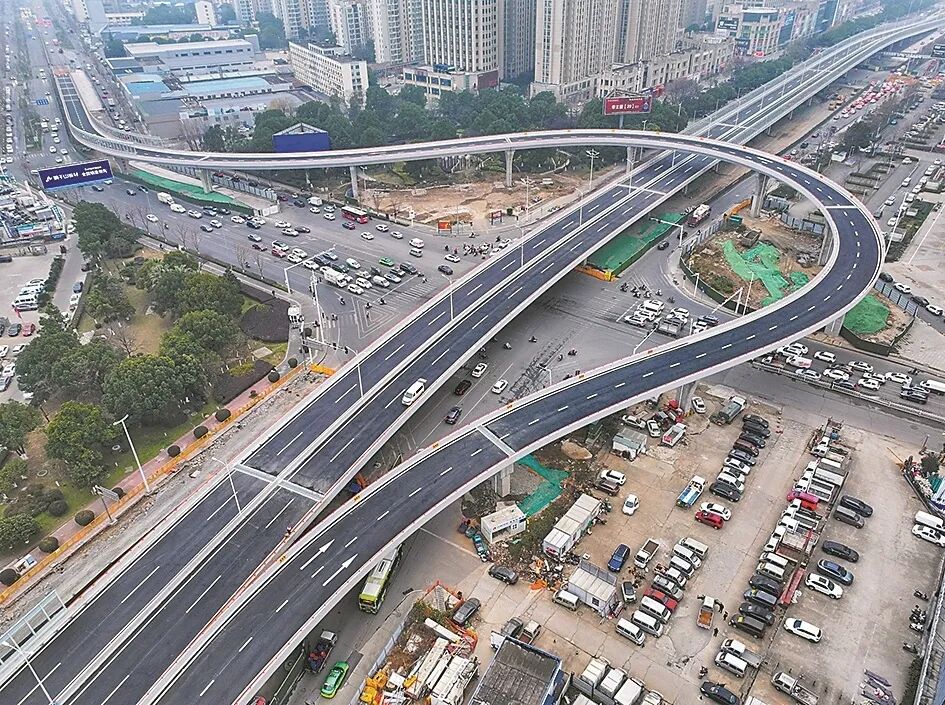项目采用科学合理的三层立体互通设计,实现不同方向车流高效分流:地面层为灯控平交路口,保障慢行交通与短途转向需求;高架一层为邓城大道东西向主线高架,满足长距离快速通行;高架二层为邓城大道东往南左转匝道,精准破解关键转向车流拥堵难题。